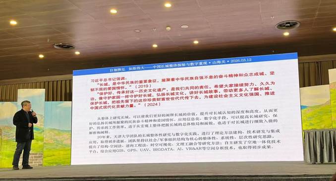 在讲座中,张玉坤教授结合天津大学团队二十余年研究成果,阐释了长城作为由边墙、军事聚落、驿传烽传、军需屯田、市口贸易共同构成的复杂“巨系统”本质。为了让听众更直观地理解,张教授精心选取了多个典型案例。从春秋战国时期诸侯互防的紧张局势,到明代九边重镇防御体系的严密布局;从“烽传千里”构建起的古代信息高速路,到互市贸易促进的民族交融,这些生动鲜活的案例全方位展示了长城在拒止冲突、保境安民、纲维秩序等方面发挥的重要作用。讲座还重点展示了无人机低空摄影、卫星遥感、大数据等手段在长城全线数字化保护中的应用成果。通过这些高科技手段,古老的长城在数字世界中得以“永生”,让听众深刻感受到科技与文化融合带来的无限魅力。